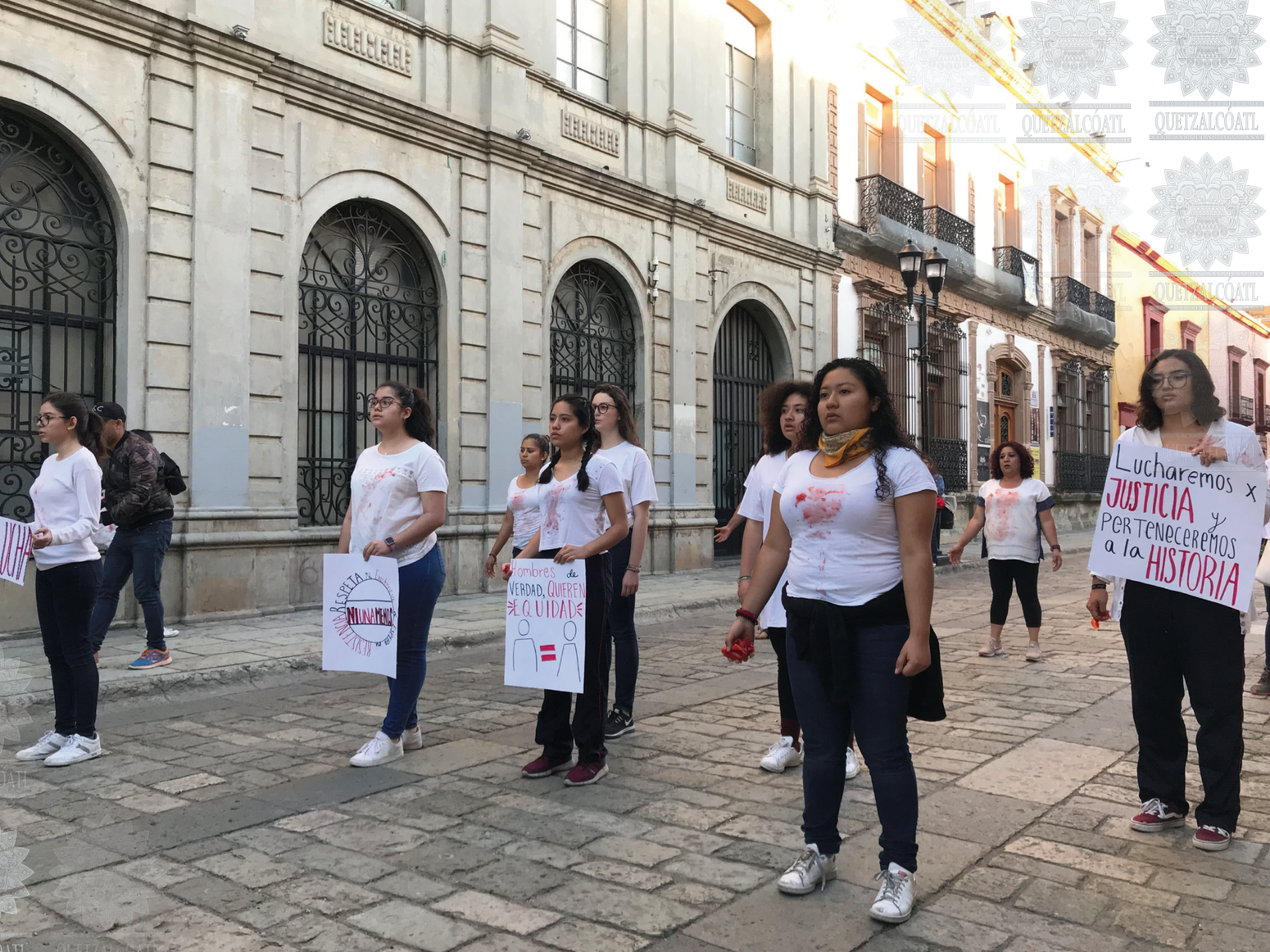 Las actrices oaxaqueñas, Liliana Alberto y Lucina Rojas, en compañía de amigos, familiares y conocidos se vistieron de blanco frente a uno de los sitios turísticos más populares de la ciudad. Con carteles y una representación artística hicieron un llamado de alerta a los pobladores para reflexionar sobre los feminicidios suscitados en los Valles Centrales, así como en las demás regiones del estado y resto del país.
